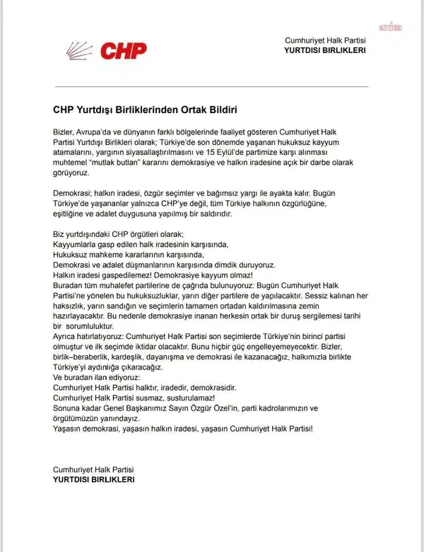 “Bizler, Avrupa’da ve dünyanın farklı bölgelerinde faaliyet gösteren CHP Yurtdışı Birlikleri olarak Türkiye’de son dönemde yaşanan hukuksuz kayyum atamalarını, yargının siyasallaştırılmasını ve 15 Eylül’de partimize karşı alınması muhtemel mutlak butlan kararını demokrasiye ve halkın iradesine açık bir darbe olarak görüyoruz. Demokrasi; halkın iradesi, özgür seçimler ve bağımsız yargıyla ayakta kalır. Bugün Türkiye’de yaşananlar yalnızca CHP’ye değil, tüm Türkiye halkının özgürlüğüne, eşitliğine ve adalet duygusuna yapılmış bir saldırıdır. Biz yurtdışındaki CHP örgütleri olarak kayyumlarla gasp edilen halk iradesinin karşısında, hukuksuz mahkeme kararlarının karşısında, demokrasi ve adalet düşmanlarının karşısında dimdik duruyoruz. Halkın iradesi gasbedilemez.”