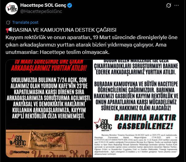 Sol Genç’in sosyal medya hesabından yapılan açıklamada, “19 Mart’ta geleceğini savunan gençleri, barınma haklarına saldırarak cezalandırmaya çalışıyorlar! Hacettepe Üniversitesi’nde okuyan 4 arkadaşımız, 19 Mart’ta haklarını savunduğu için uyduruk gerekçelerle yurtlarından atıldı. Halk düşmanı politikalarıyla gençlere barınma imkanı bırakmayan rejimin arkadaşlarımızı yaşamlarıyla cezalandırmasını kabul etmiyoruz. Korku duvarlarınızı yıktık, sıra saltanatınızda!” ifadelerine yer verildi.